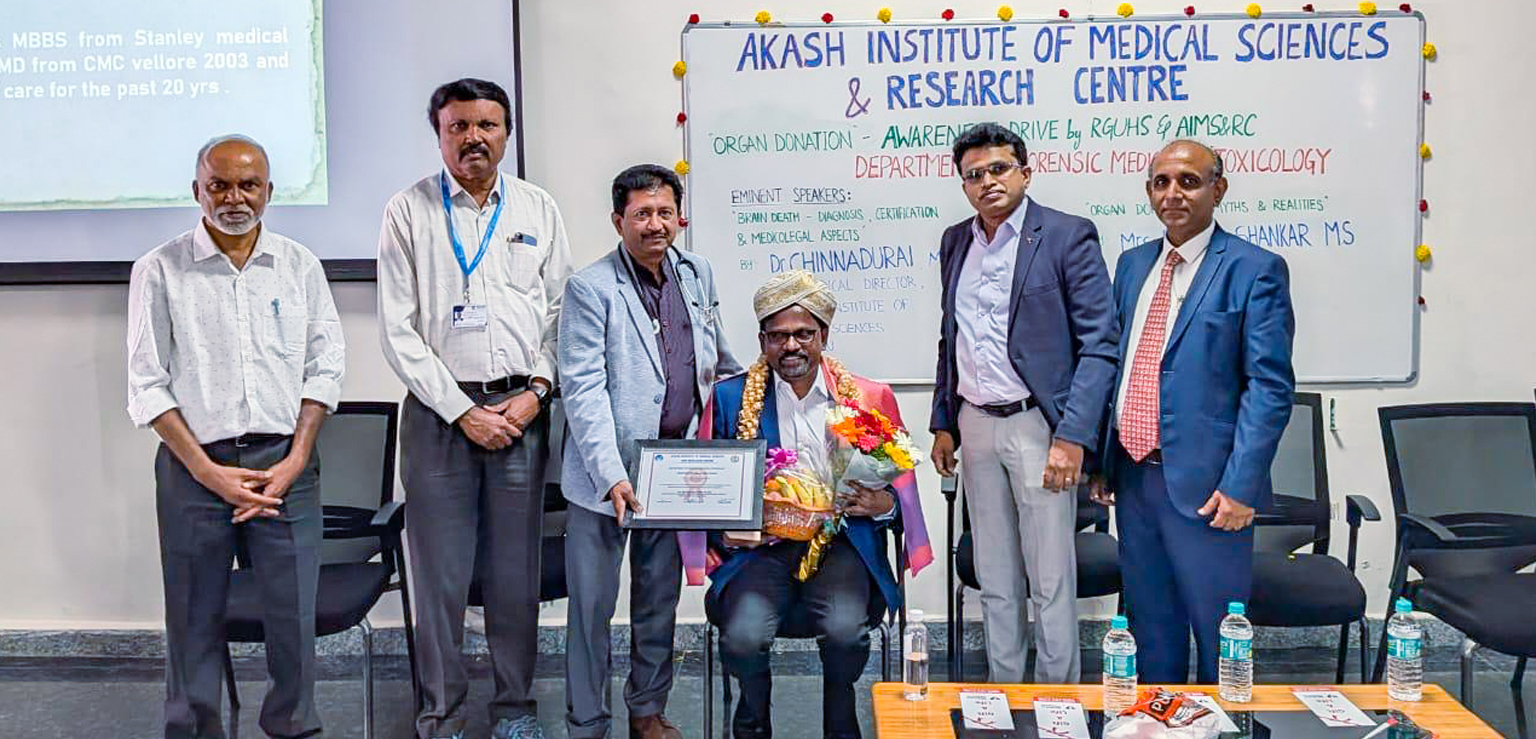 The Department of Forensic Medicine and Toxicology, Akash Institute of Medical Sciences and Research Centre, organized a Guest Lecture on “Organ Donation” and an Awareness Drive on 12th November 2025, from 10:30 AM to 1:00 PM at the APJ Abdul Kalam Lecture Hall, as part of the RGUHS and AIMS&RC joint initiative.